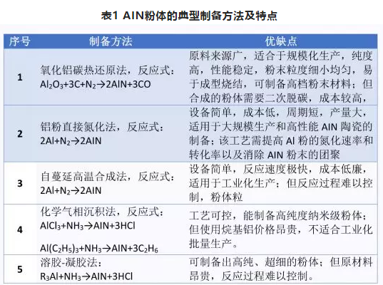 氮化鋁陶瓷的優良性能與原材料粉體的性能有著直接的關系,高性能AIN粉體是制備高熱導率AIN陶瓷的關鍵。制備AIN粉體的方法有很多種(見下表1),也都存在各自的不足,但他們都有一個共同點就是成本較高。