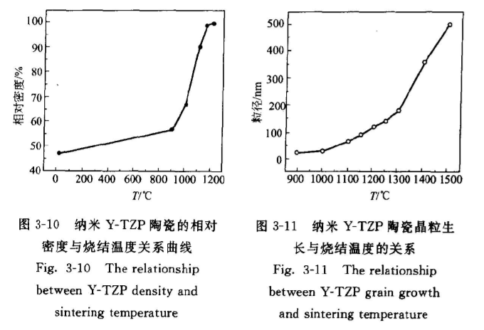 密度與晶粒的變化是燒結(jié)過程中最基本的變化。圖3-10是材料相對密度與燒結(jié)溫度的關(guān)系。從圖3-10可見,和普通陶瓷一樣,納米Y-TZP陶瓷的無壓燒結(jié)大致也可分為三個階段: