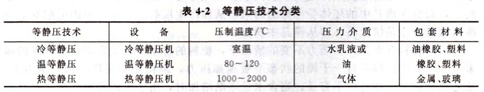 (2)等靜壓成型類(lèi)型等靜壓技術(shù)按其成型和固結(jié)時(shí)溫度的高低,一般可分為三種:冷等靜壓(CIP)、溫等靜壓(WIP)和熱等靜壓(HIP)。由于等靜壓時(shí)溫度的差別,因此三種等靜壓技術(shù)分別采用了相應(yīng)的設(shè)備、壓力介質(zhì)和包套模具材料,如表4-2所示。