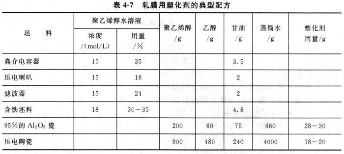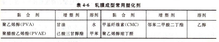 軋膜成型(sheet forming)也屬于可塑法成型。將準(zhǔn)備好的坯料拌以一定量的有機(jī)塑化劑,使之具有可塑性。塑化劑是由黏合劑、增塑劑、溶劑、消泡劑等配制而成。黏合劑要求有足夠的黏合力、較好的成膜性能(良好的延展性和韌性),并具有燒后灰分少、無毒性的特點(diǎn)。增塑劑所起的作用是插入高分子化合物的鏈段之間,減弱相互之間吸引力,使黏合劑受力變形后不致出現(xiàn)彈性收縮和破裂,從而提高坯料的可塑性。溶劑的主要作用是溶解黏合劑和增塑劑。軋膜成型常用的黏合劑、增塑劑和溶劑列于表4-6中。