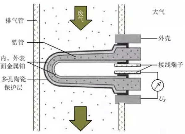 發(fā)動機排出的廢氣從氧傳感器的端部經(jīng)過并與鋯管的外表面接觸,空氣從傳感器尾部的通氣孔進(jìn)入鋯管的內(nèi)表面。在溫度超過300℃時氧發(fā)生電離,根據(jù)ZrO2的測氧原理,由于大氣中的氧氣比廢氣中的氧氣多,因而氧離子從大氣側(cè)向廢氣側(cè)擴散,兩側(cè)離子的濃度差產(chǎn)生電動勢,此時鋯管相當(dāng)于一個微電池,向外輸出電壓信號。鋯管內(nèi)外表面氧濃度差越大,輸出電壓信號也越高。