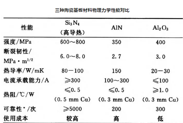 此外,氮化硅的線膨脹系數與Si、SiC和GaAs等半導體材料匹配良好,這使氮化硅陶瓷成為一種極具有吸引力的高強高導熱電子器件基板材料。氮化硅、氮化鋁及氧化鋁陶瓷的力學性能對比見下表。